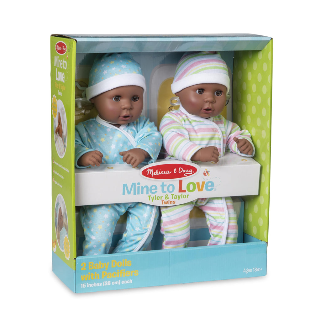 Melissa & Doug Mine to Love Twins Tyler & Taylor 15” Dark Skin-Tone Boy and Girl Baby Dolls with Rompers, Caps, PacifiersTwo 15-inch clothed boy and girl baby dolls with dark skin tone that can suck their thumbs or pacifiersDolls have soft, huggable bodies, wipe-clean limbs and heads, eyes that open and closeCoordinating removable caps and rompers; dolls suck thumbs or included pacifiersPerfect first dolls for nurturing and cuddling and for developing social and emotional skillsMakes a great gift for toddlers to preschoolers, ages 18 months to 5 years, for hands-on, screen-free play