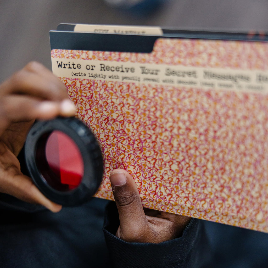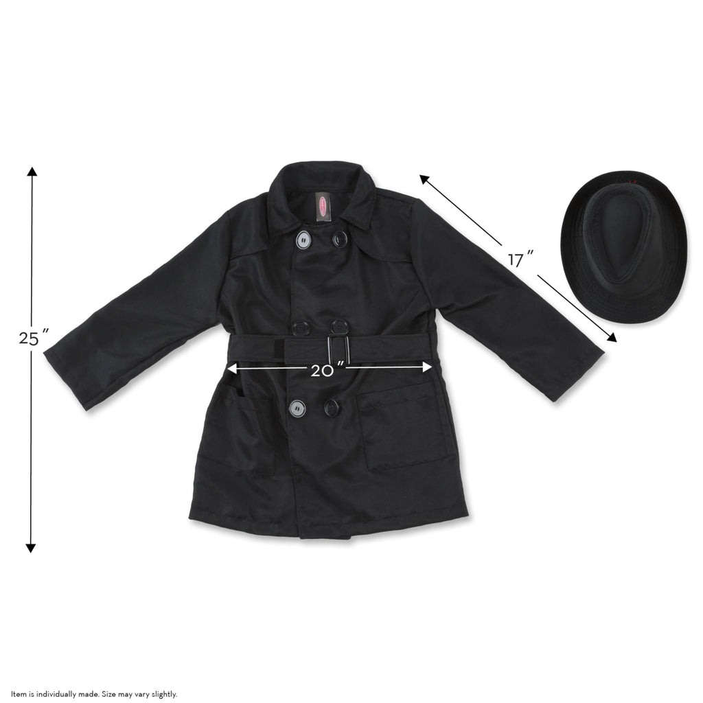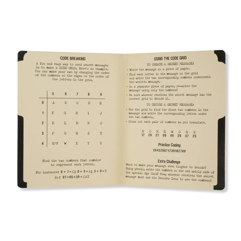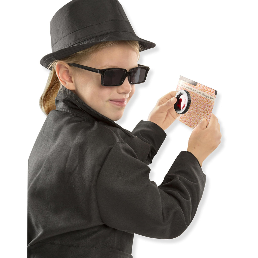 - Includes black spy jacket, hat, rear-view mirrored sunglasses, secret coded message card, decoder lens, spy guide