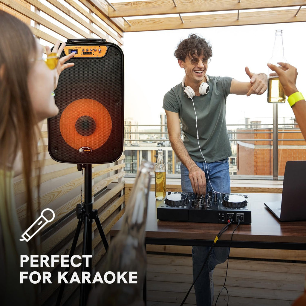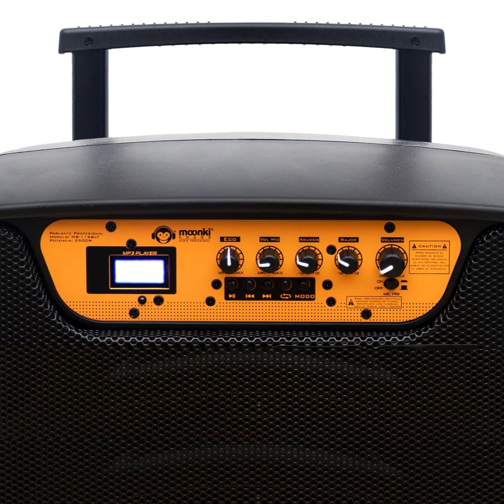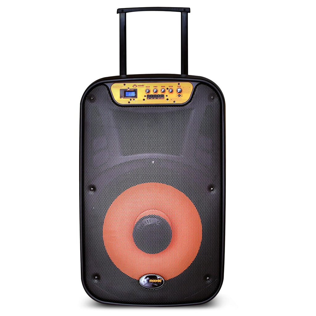 Moonki Sound MS-115B Active PA System Bluetooth Speaker with Microphone - BlackLIVE EVENT SET: This is one of the best bluetooth speakers with microphone that’s built-in plastic and wired. Plus the wired microphone, this stand speaker completes the set with a tripod to place it firmly at any space and show up. It functions as a dj system complete package and event loud speakers. Imagine all the music events you can manage with this powerful soundful kit!OUTDOOR MEETINGS: Easily portable, this speaker incorporates a retractile handle and wheels. Already planning an outdoor event? Take the outdoor movie speakers with you!WIRELESS CONNECTIVITY: This wireless outdoor pa system connects easily to wireless connectivity Bluetooth 5.0 without any interruptions.MULTI-CONNECTION: Multiple forms of use are waiting for you! This speaker and microphone for events has many inputs for you to enjoy the power of sound in the way you want. It is possible to connect it to microphone and AUX wire. Plus it has the DC line input.LED LIGHTS: The wireless pa system with microphone and speakers functions as a party speaker with microphone since its lightning woofer is totally covered with LED rings that perform dynamic effects at your karaoke parties.SHARPNESS AT YOUR PARTY: This active pa two-way loudspeaker with stand presents a 15" woofer with 850g magnet and 1.5" Kapton coil, plus a 1" tweeter and an AB amplifier board. Ideal audio streaming equipment for those who are looking for dj speakers with built in amplifier.EQUALIZATION AND MIC CONTROL: Manage the equalizations of your bluetooth speaker with total control of it. Through the control panel or remote control it is possible to level the bass and treble as well as the mic priority function, mic echo and mic volume.