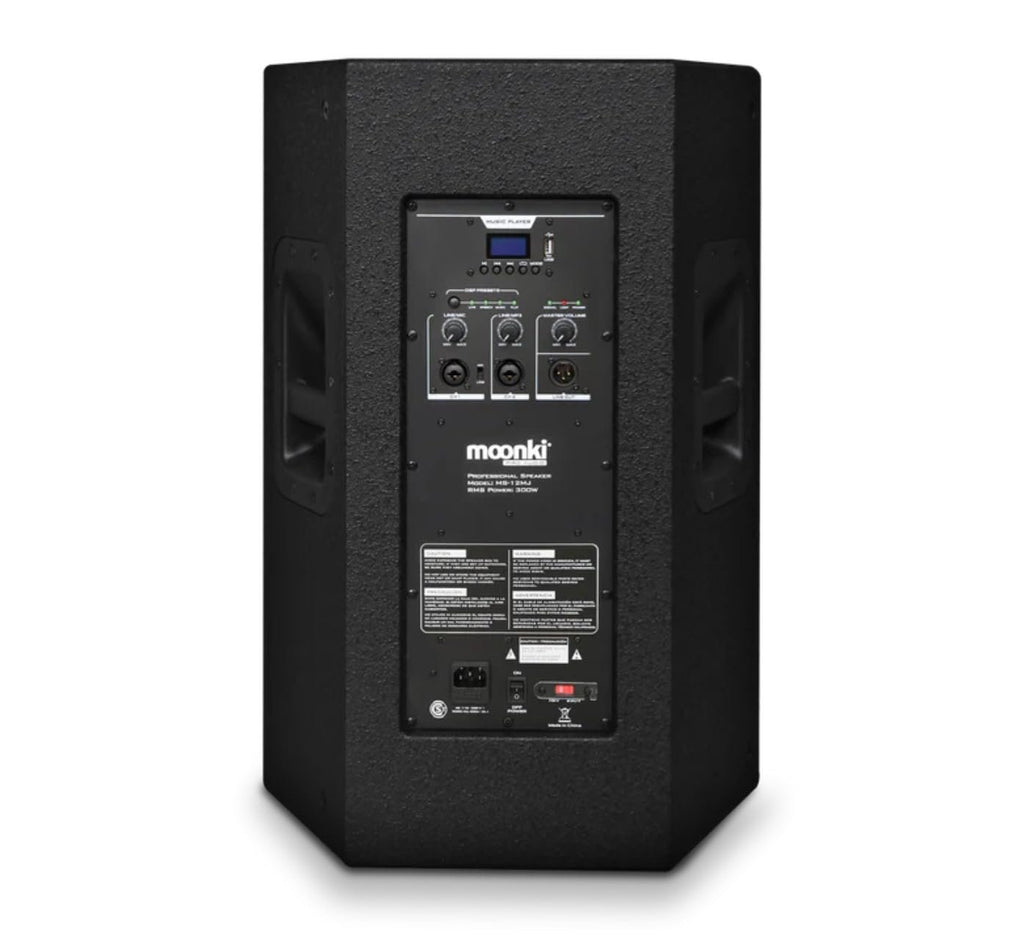 Moonki Sound MS-12MJ Pro Audio Speaker 12-inch Woofer Class D Amplifier with DSP Digital Sound Processor DJ Setups Live PerformancesMoonki MS-12MJ Professional-Grade Sound with DSP Precision. Whether you're rocking a live event, setting up a studio, or hosting a party, the MS-12MJ delivers a rich, immersive audio experience backed by smart technology and robust engineering. The Moonki MS-12MJ is built for those who want more than just volume—it’s about precision, adaptability, and presence.FEATURES || Digital Sound Processor (DSP) : Optimizes audio frequencies for different environments and genres, ensuring clean highs and deep lows. Class D Amplifier : Efficient power delivery with minimal distortion, perfect for high-volume applications.Multiple Inputs : Easily integrate microphones, mixers, or other audio sources via XLR and 6.35mm jacks. Bluetooth Streaming : Enjoy wireless playback from mobile devices with stable connectivity. Professional Build : The wooden enclosure enhances sound resonance and gives it a sleek, pro-grade look.SPECIFICATION || Model : MS-12MJ | EAN : 7798135513078 | Type : Professional Speaker | RMS Power : 300W | Amplifier : Class D with DSP Processor | Woofer Size : 12 Inches | Tweeter Size : 1.7 Inches | Wireless Connection | Switched Line Input / XLR Microphone Input / 1/4 Inch Input | XLR Line Input / 1/4 Inch Input | XLR Line Output | High-Quality Wooden Enclosure | 4 Pre-configured DSP Equalizations | Power Input: 115-230V |ITEM DIMENSION || Dimensions (Height x Width x Depth) : 25.0 x 16.1 x 15.2 in | Dimensions (Height x Width x Depth) : 635 x 410 x 385 mm | Weight: 50.7 lb / 23 kg