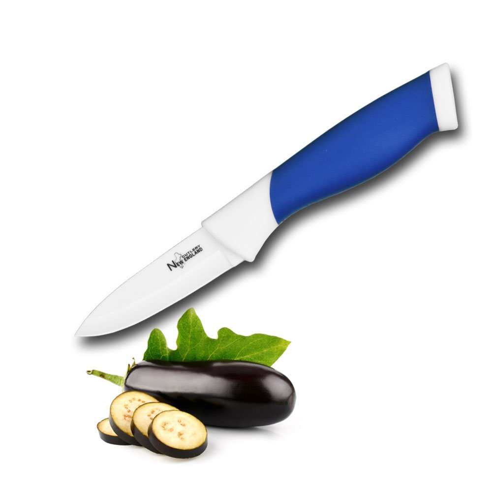 New England Cutlery Ceramic Paring Knife, 3", BlueMade of advanced ceramic - sharper, stronger and more durableNever rust, brown food or leave a metallic smell or taste on foodSoft and comfortable grip handle in colorsWide open blade sheath for easy storagePacked in PVC gift box