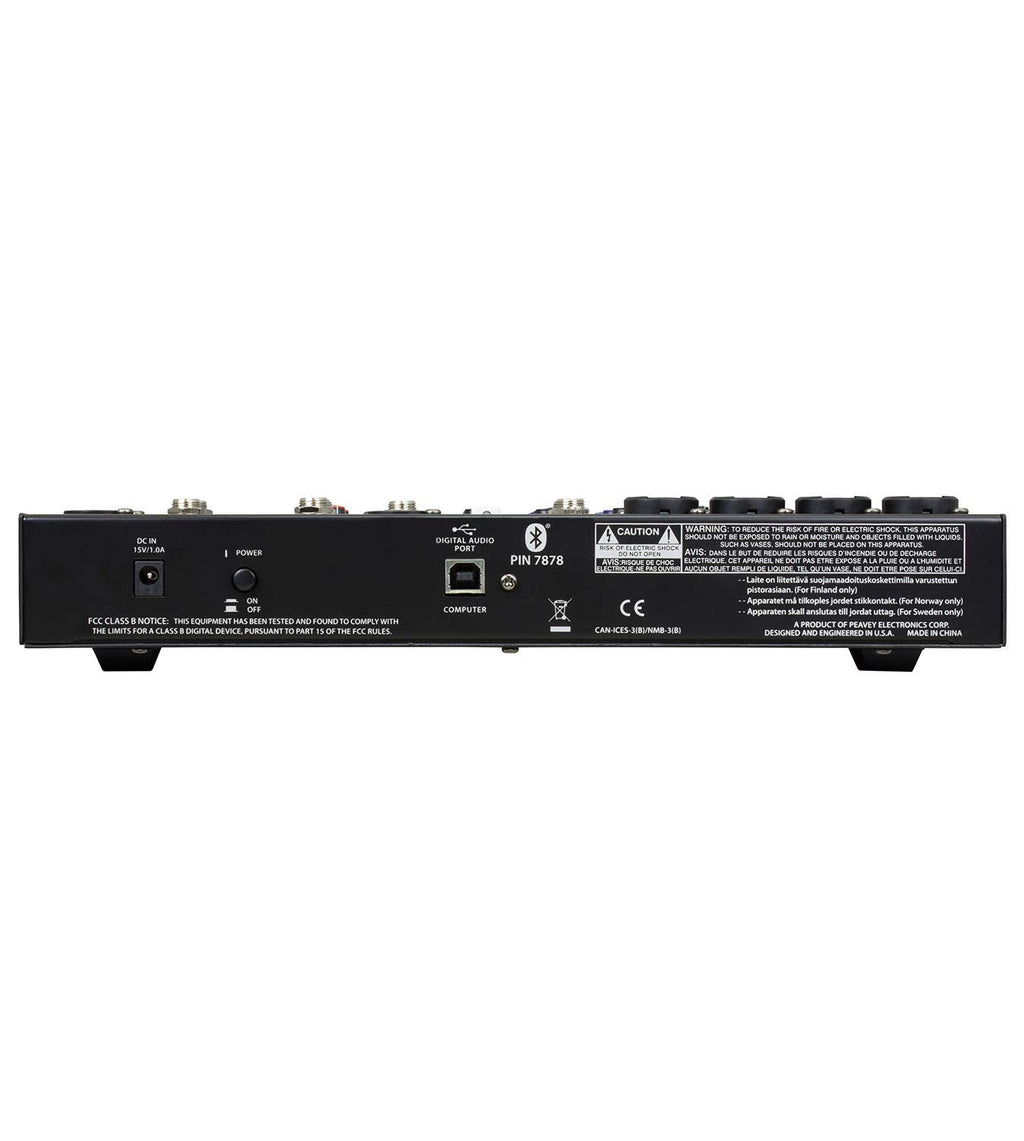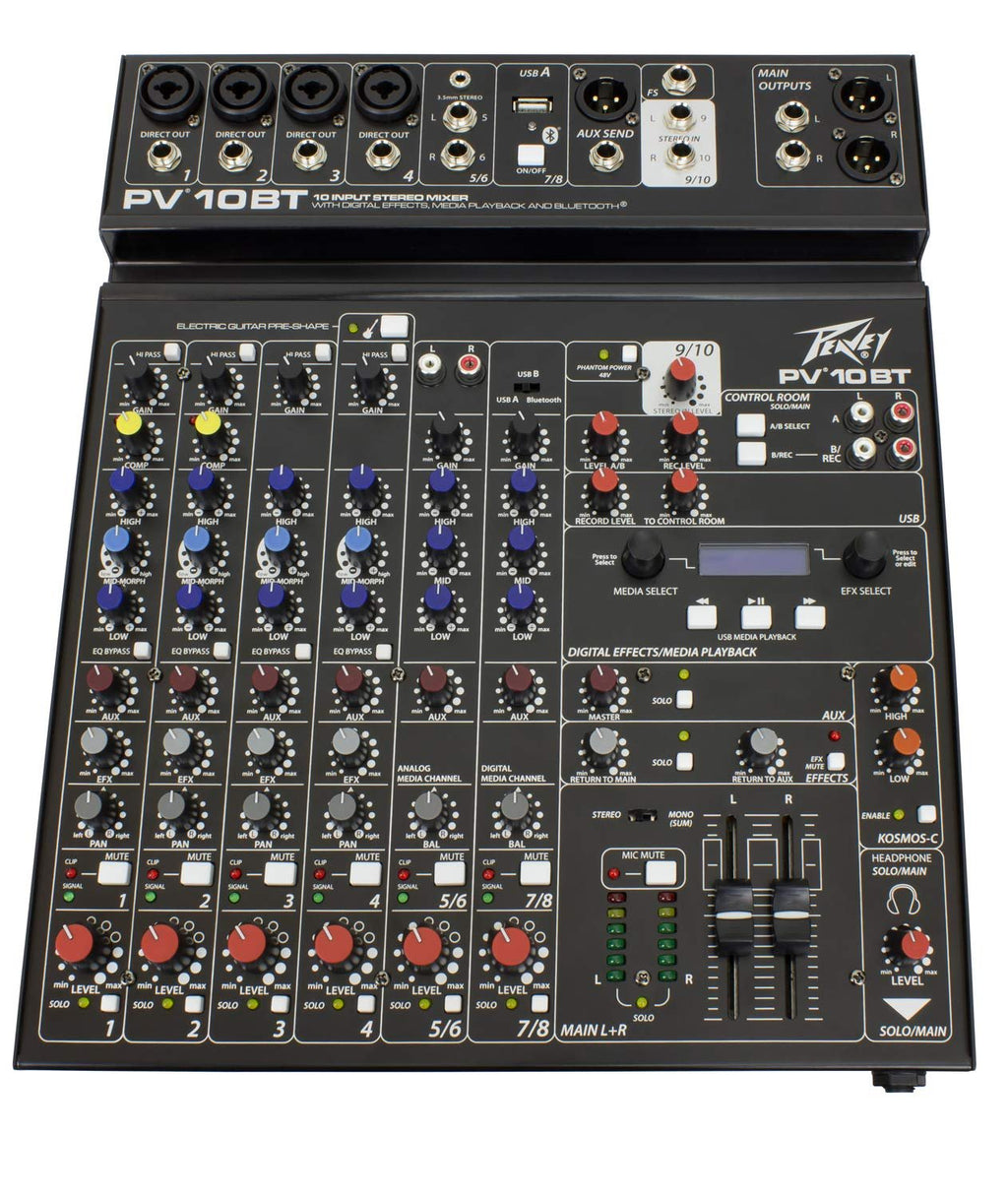 Peavey PV 10 BT Compact Mixer with BluetoothNew rugged, slim, low-profile console designConvenient tablet cradle4 combination XLR/1/4 low noise mic preampsSelectable Hi Pass Filter on first 4 inputs3-band EQ on all channels