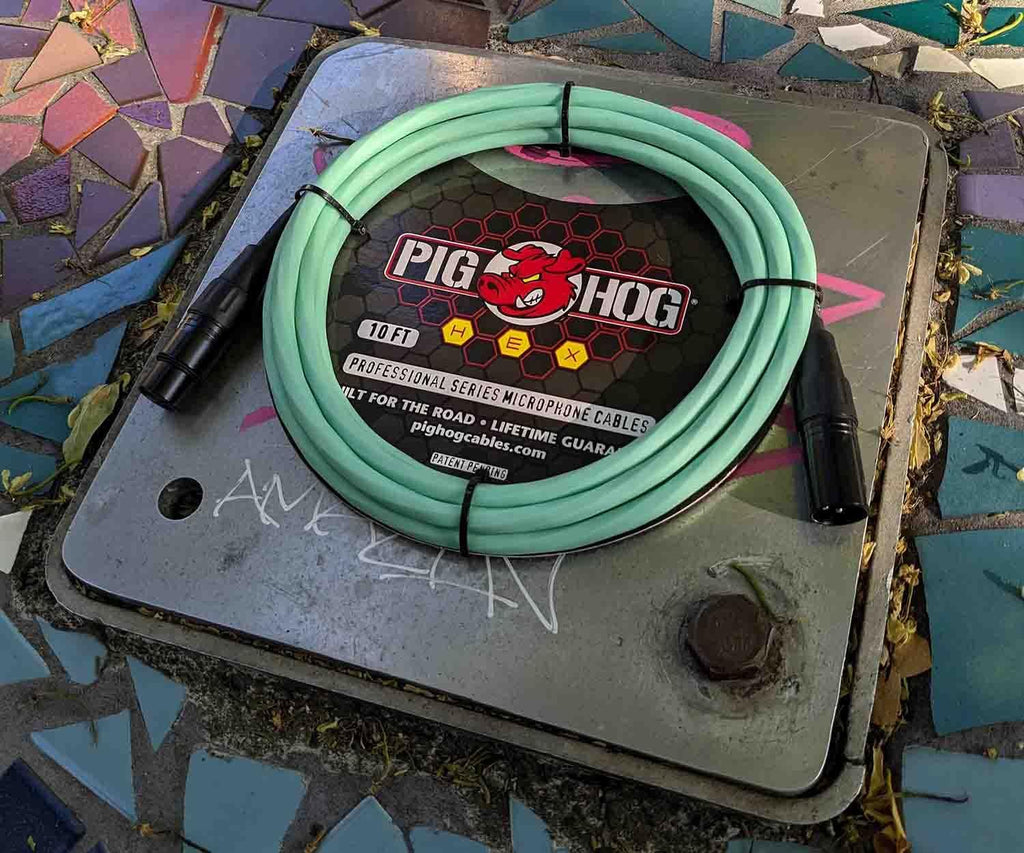 Pig Hog PHMH10SG Hex Series Mic Cable, Seafoam Green 10ftExceptional tangle-free coiling10 Ft CableHigh performance microphone cableXLR - XLR connectors6 sided spiral-extrusion PVC sleeve