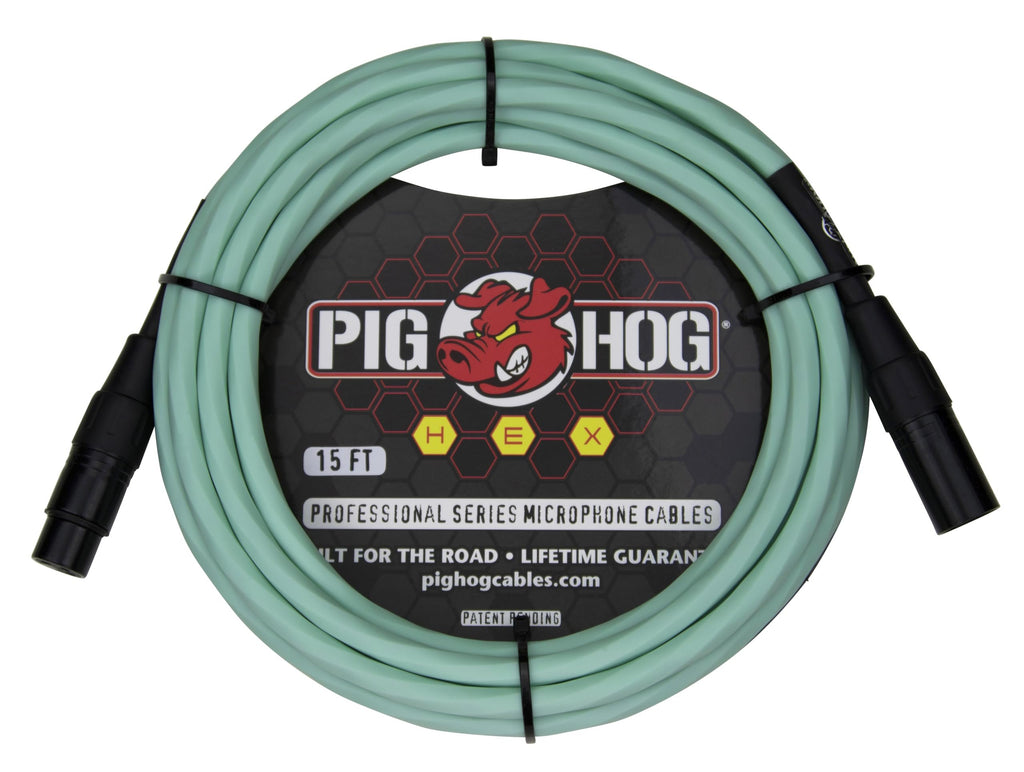Pig Hog PHMH15SG Hex Series Mic Cable, Seafoam Green 15-Feet Exceptional Tangle-Free Coiling Patented 6 Sided Spiral-Extrusion PVC Sleeve XLR - XLR ConnectorsFEATURES || * Brand : Pig Hog || * Model Number : PHMH15SG || * Cable Length : 15 feet || * Exceptional tangle-free coiling || * High performance microphone cable || * Patented 6 spiral-extrusion PVC sleeve || * XLR - XLR connectors || * Lifetime guarantee ||The PIG HOG PHMH15SG is a hex series microphone cable with a seafoam green color and a 15ft length.The new patented Hex Series Cables from Pig Hog represent the pinnacle of cable design, featuring our proprietary 6 sided spiral extrusion process that provides exceptionally tangle free coiling time after time, and will stand up to the most grueling conditions imaginable, on stage, at home, or in the studio. ||We’ve also improved our proprietary OFC conductor technology and robust shielding to ensure these are the best sounding Pig Hog cables ever made - so that your sound is crystal clear, without noise or interference, every time you use them! ||Each cable is hand tested before shipment, and we back up our quality with a lifetime warranty so you can be sure your Pig Hog Cables will be an integral part of your rig for years to come.
