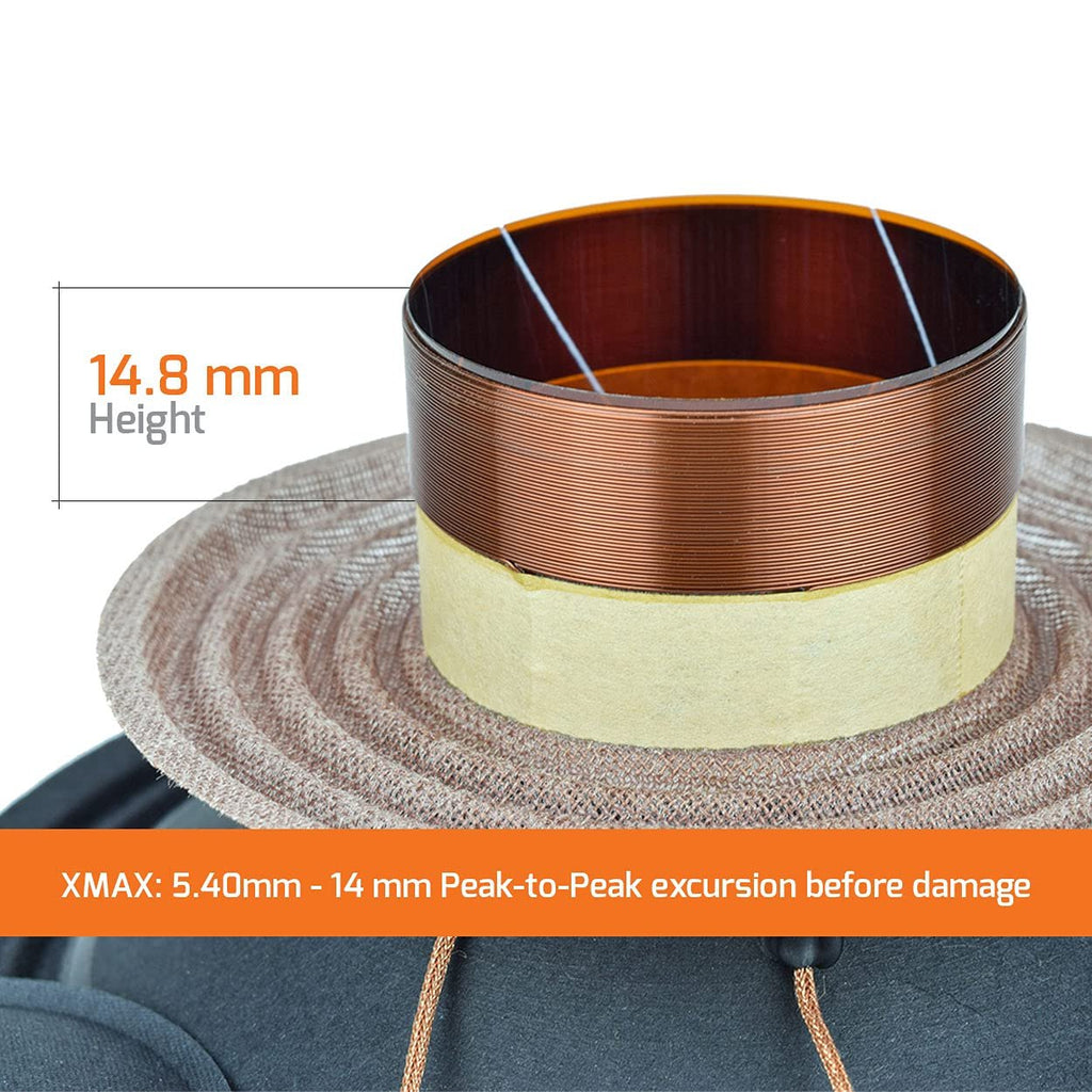 Its CCAW voice coil has 14.8 mm of winding wire, giving it an incredible 5.40 mm Xmax with capability of 14 mm Peak-to-Peak excursion before damage, which allows its cone to travel over 0.55″ giving a heck of punch.