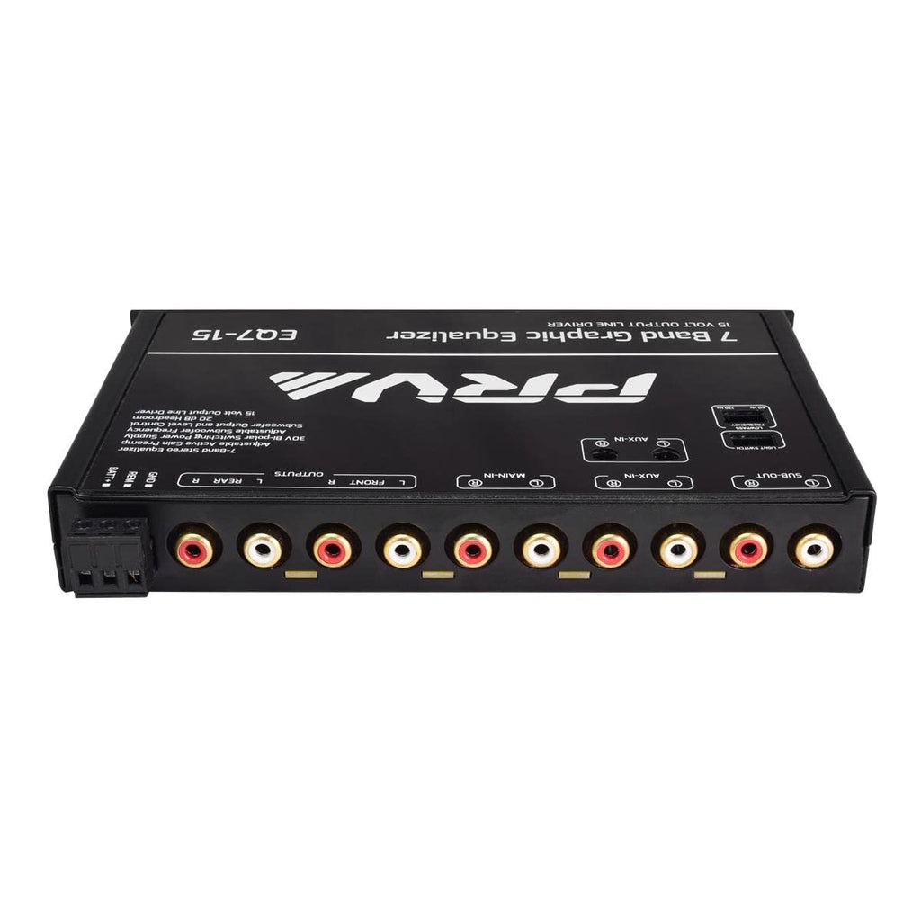 PRV AUDIO EQ7-15 7 Band Graphic Equalizer 15 Volt RCA Line-Level Output with Fader and Subwoofer Level Control for Car Audio