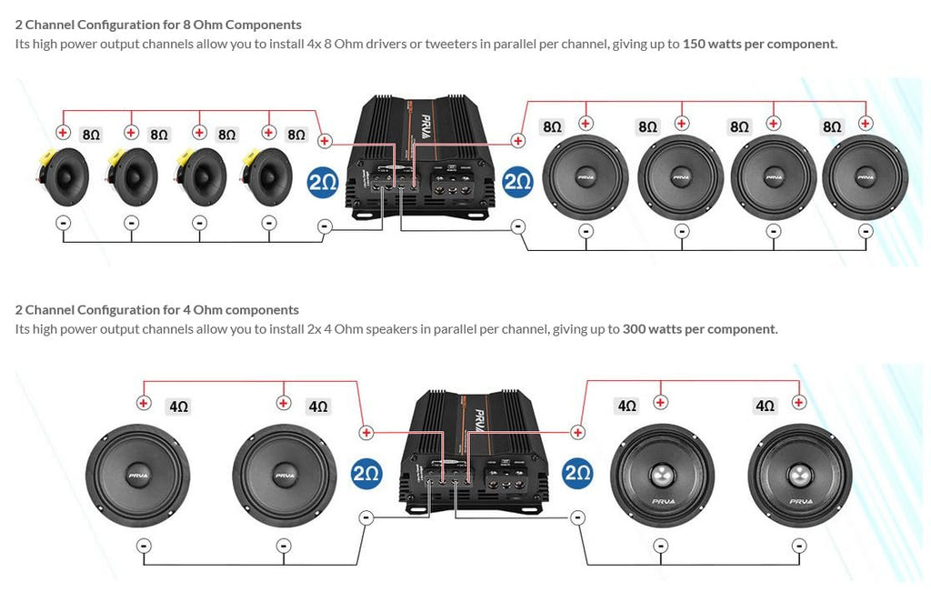 2 Channel car audio amplifier gives you the benefit of wiring multiple speakers and dividing the power per channel. Its 2 Ohm channels allow you to install 8x 8 Ohm drivers or tweeters, 4 per channel in parallel