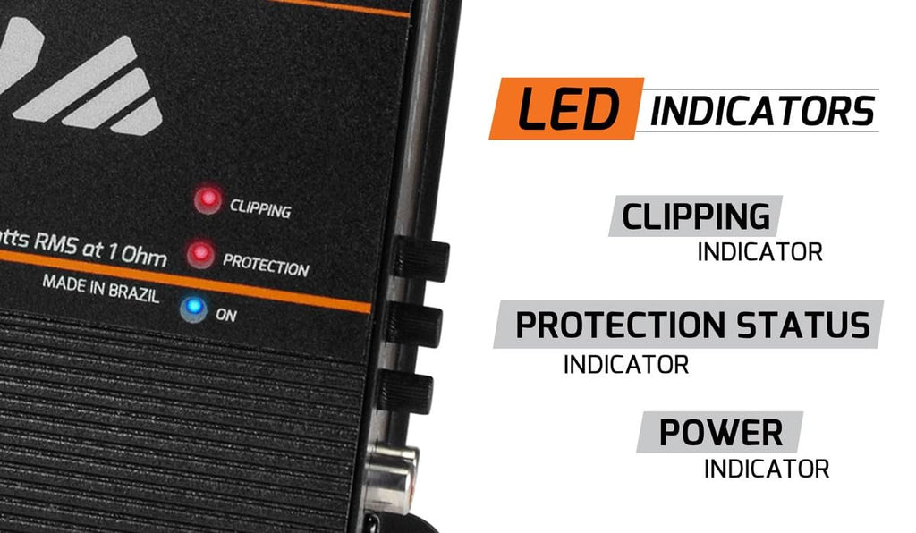 - 4-way protection circuitry features high voltage, low voltage, shortage, and current protection. Built-in Power/Protection/Clip LED indicators on the top panel.
