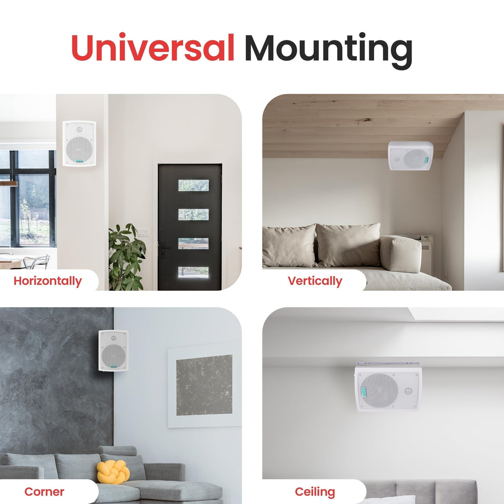 - UNIVERSAL MOUNTING: The pair of speakers are stored in a rugged, heavy-duty grill cabinet enclosure. Designed to be mounted horizontally or vertically on a wall, corner or ceiling. Includes (2) adjustable angle spring loaded U mounting plate bracket
