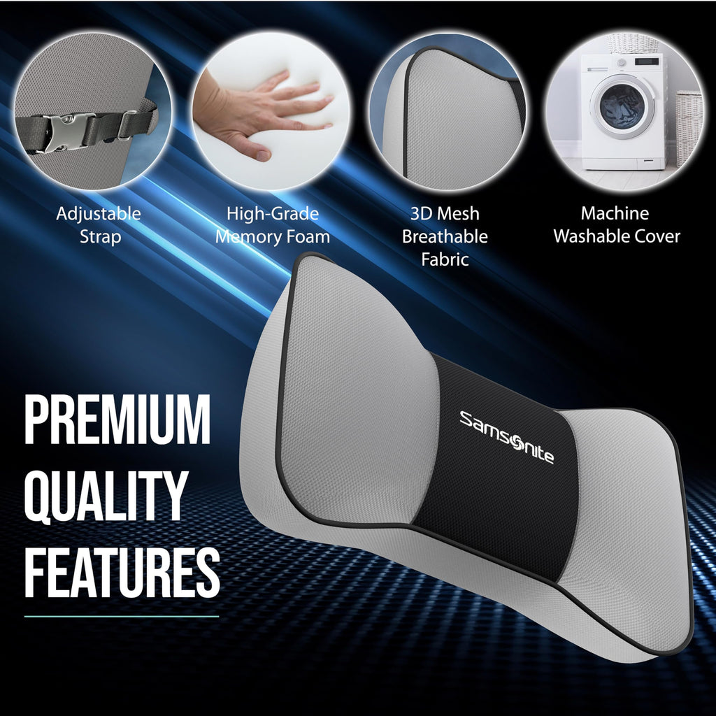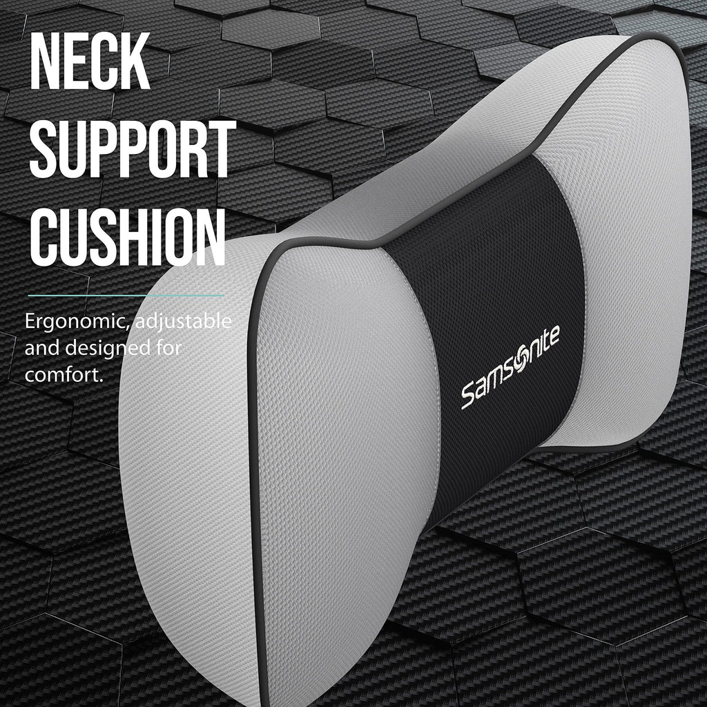 Samsonite Neck Pillow for Car – Ergonomic Memory Foam Headrest Cushion – Car Seat Support for Driving Comfort – Compact Neck Rest – Travel Pillow for Long Road Trips𝗘𝗿𝗴𝗼𝗻𝗼𝗺𝗶𝗰 𝗦𝘂𝗽𝗽𝗼𝗿𝘁 – Engineered for comfort, this car neck pillow for driving relieves tension and fatigue during long drives, perfectly conforming to your neck's natural shape. As a top-rated ergonomic pillow and cervical neck pillow, it promotes alignment, making it ideal for anyone seeking road trip essentials or long-term neck support.𝗠𝗲𝗺𝗼𝗿𝘆 𝗙𝗼𝗮𝗺 𝗖𝗼𝗺𝗳𝗼𝗿𝘁 – Crafted from high-density memory foam, the car neck support pillow for driving adapts to your body for superior pressure relief and optimal support mile after mile. It doubles as a cervical pillow and neck pain pillow, perfect for reducing strain on long trips and supporting overall spinal health.𝗩𝗲𝗿𝘀𝗮𝘁𝗶𝗹𝗲 𝗙𝗶𝘁 – Designed to be universally compatible, this neck pillow for car headrest easily attaches to any headrest, ensuring a secure fit across cars, SUVs, and even Tesla headrest pillow configurations. Whether you're outfitting your ride with truck accessories, BMW accessories, or Mercedes Benz car accessories, this pillow delivers premium comfort.𝗛𝗶𝗴𝗵 𝗦𝗲𝗮𝗿𝗰𝗵 𝗘𝘀𝘀𝗲𝗻𝘁𝗶𝗮𝗹 – Whether you’re after a car seat neck pillow or a neck pillow car for everyday commutes, this versatile pillow ranks among the top car travel essentials for long trips. It's also ideal as a neck pillow for traveling, part of your travel pillows for sleeping, or even a thoughtful addition to your car interior accessories collection.𝗘𝗮𝘀𝘆 𝗖𝗹𝗲𝗮𝗻𝗶𝗻𝗴 – Features a removable, washable cover that keeps your car pillow for driving seat neck clean, fresh, and always ready for your next adventure. Combine it with your favorite car seat cushion or pillows for neck and shoulder pain setup for a full body comfort experience on the road.
