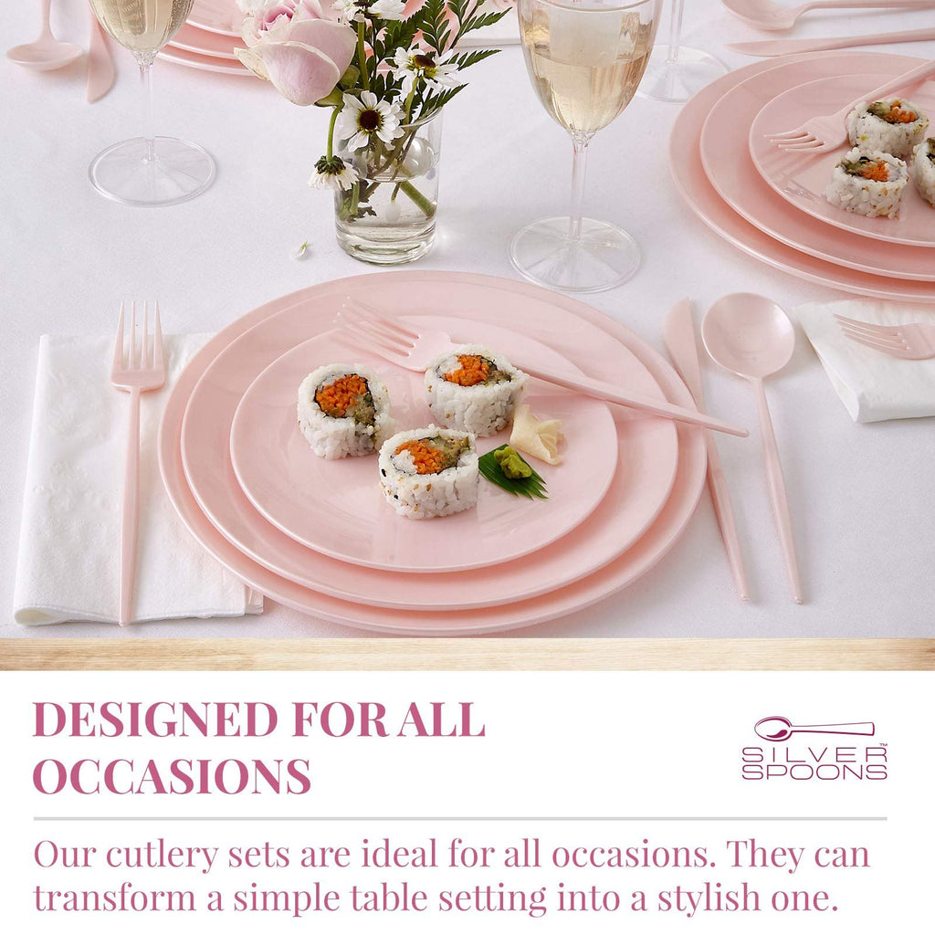 - PREMIUM QUALITY: This beautiful and versatile blush plastic silverware set is composed of high-rated heavyweight plastic materials rendering it strong enough for every type of food you might be serving. These flatware are 100% food grade and safe to use for a fine dining experience