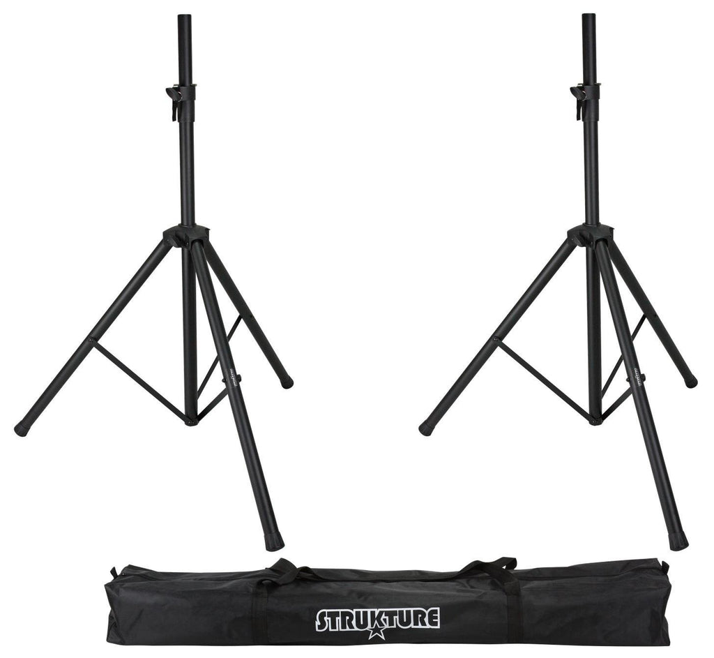 STRUKTURE SASPK2B Aluminum Speaker Stand PackStrukture speaker stands are crafted from heavy duty aluminum, and designed to offer rock solid performance on stage or offThese stands feature a single braced folding tripod base, a sturdy steel center shaft, non-slip rubber feet, and steel pins for securityThe speaker stand pack includes a carry bag with full length zipper to make storage and transportation a breeze