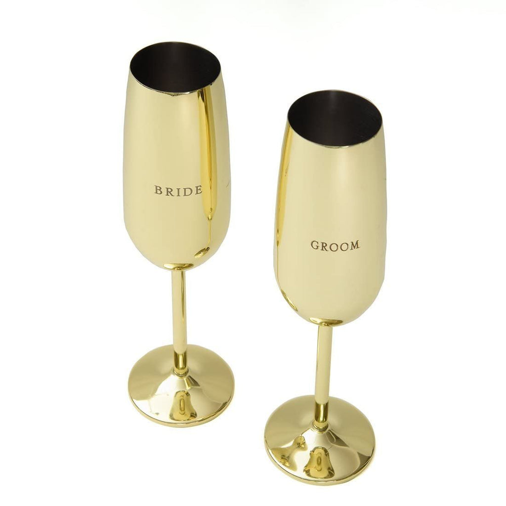 - Each glass is made with gold plated stainless steel, symbolizing the strong bond between husband and wife while the engraved ‘bride’ and ‘groom’ headlines make them stand out amongst regular flutes