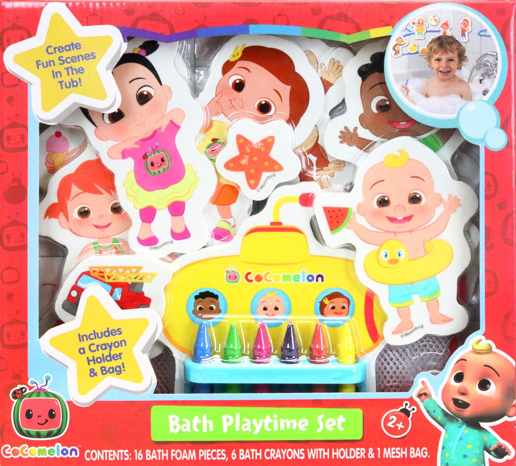 Tara Toys Cocomelon Bath Playtime SetCLING TO THE WALL WHEN WET: The foam stickers stick well to the wall when wet. Make bath time more fun by making stories.COCOMELON BATHTIME ACTIVITY SET INCLUDES: 16 bath-friendly foam pieces of Cocomelon characters, 6 waterproof bath crayons with holder and 1 mesh storage bag.BABY SAFE QUALITY: Made of thick foam, these high-quality Cocomelon stickers stay wrinkle-free and are difficult to rip even after repeated play in water. Bathing has never been more fun when you make scenes on your bathroom wall.ENABLES HAND-EYE COORDINATION: Encourage your child to recognize characters, colors, draw on the foam stickers using the waterproof crayon available in this Cocomelon waterproof bath-time activity set for kids 3 years and above.GREAT GIFT FOR KIDS: Looking for the perfect gift for parents of toddlers? Look no further, our Cocomelon bath playtime foam sticker set is an amazing gifting option for children’s birthdays, Halloween, Thanksgiving, Christmas and a fun option for party favors too.