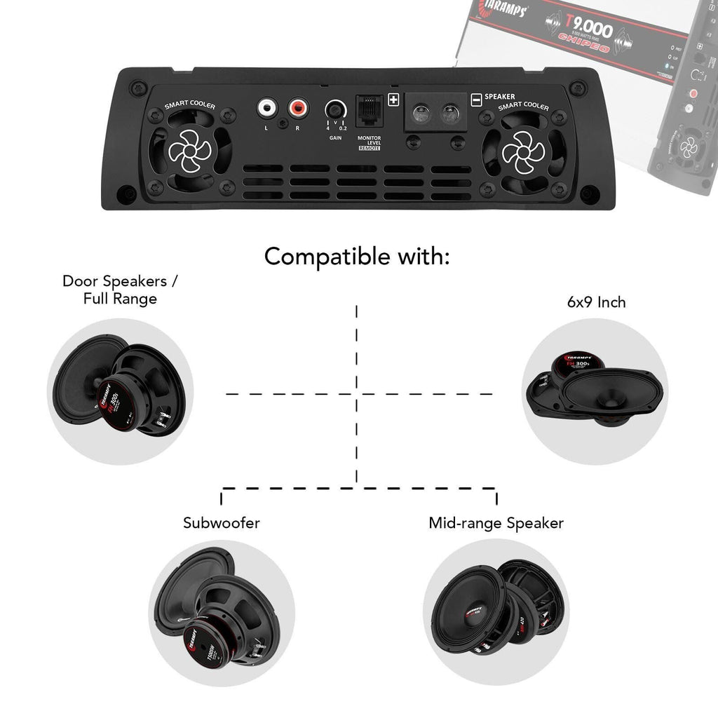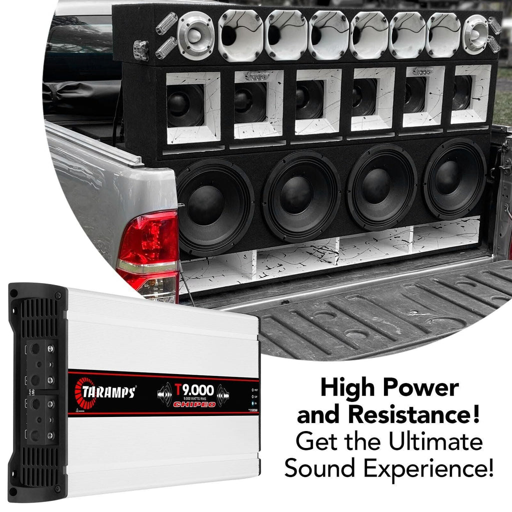 - Feel the difference with the Taramps T9000 Chipeo, an amplifier that redefines the standards of musical performance. Available in 1 or 2 Ohm versions, this fantastic amplifier offers an impressive 9000 WRMS at 12.6 Volts, and can reach an astonishing 11,000 WRMS at 14.4 Volts. With a wide frequency response of 5Hz to 5kHz, it covers sub-bass, bass, mid-bass and mid. Experience much more strength, quality, efficiency and resistance, and take your sound experience to a new level. ||