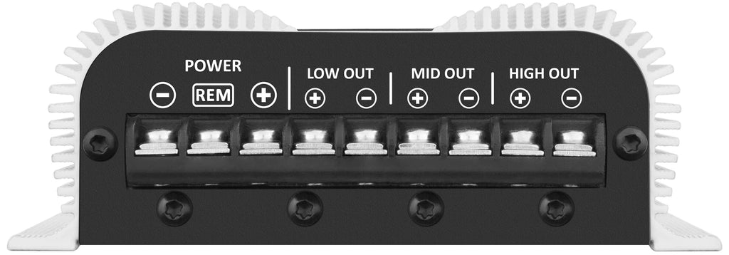 This is a 3-way component, and each of them has pre-defined frequency cuts. || VIA LOW - aimed at the speakers. It has cuts between 35Hz and 1KHz, delivering 340 Watts RMS at 2 ohms or 200 Watts RMS at 4 ohms. VIA MID - aimed at drivers. It has cuts between 1KHz and 7KHZ, delivering 30 Watts RMS at 4 ohms. VIA HIGH - aimed at super tweeters. It has cuts between 7KHZ and 50KHz, delivering 30 Watts RMS at 4 ohms. ||