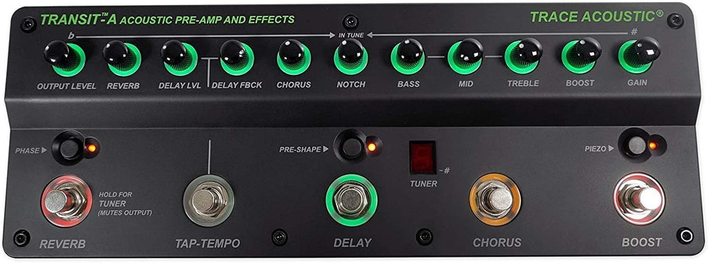 Optimize Your Acoustic-electric Guitar Plugging your acoustic-electric guitar directly into the PA is convenient. But you're at the mercy of the engineer. That's why Trace Elliot created the Transit A acoustic preamp pedal. Plug into the Transit A before connecting to the PA. It has all the tone-shaping tools you need to achieve a professional sound: a 3-band EQ, Chorus, Delay, Reverb, a tuner, and more! At GearNuts, we appreciate how the Transit A's color-coordinated backlit controls make it easy to see on a dark stage. And it fits in your guitar case! The Trace Elliot Transit A acoustic preamp pedal includes a high-quality embroidered carry bag and top-notch software package.All the tools you need to achieve a professional sound 3-band EQ for tone-shaping Chorus and Reverb with simple 1-knob operation Delay with Level, Feedback, and Tap-Tempo controls Phase Reverse for fixing stubborn phase issues Notch Filter for removing problem