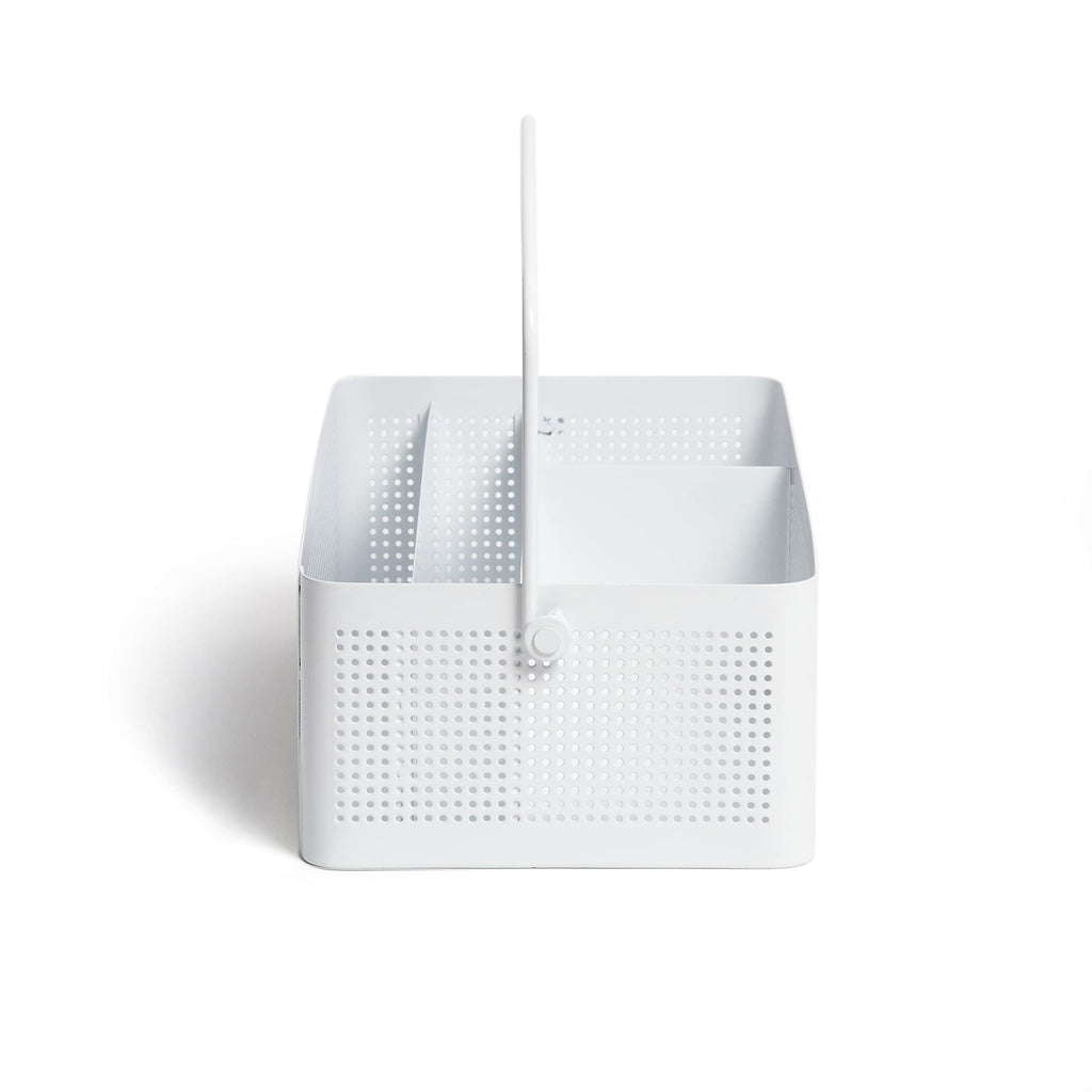 U Brands Modern Perforated Caddy Desktop Organizer, Office Supplies, Metal, White, 1 CountCut down on clutter and minimize distractions in your workspace with our Modern Perforated Caddy Desktop OrganizerClean, white surfaces, rounded corners and a carrying handle make this caddy a wonderful addition to your desktopThis organizer is perfectly sized to store your writing utensils, paper clips, sticky notes and even a journal or twoSmaller compartments are ideal for push pins and other miniscule accessoriesCombine this contemporary organizer with other accessories from our Modern Perforated line to create your own complete set