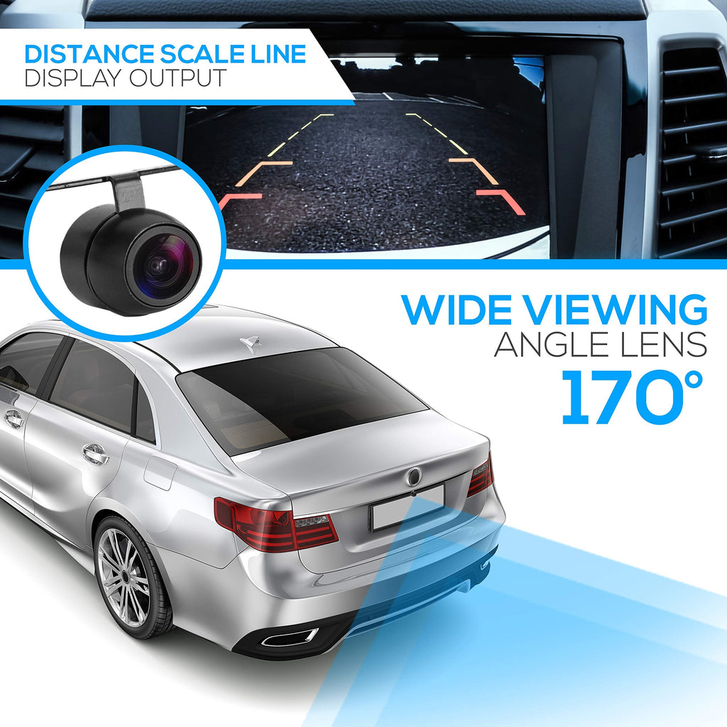 DISTANCE SCALE LINES: A rearview camera that features an accurate distance scale line display for proper parking and reversing without relying on side mirrors. It is perfect for backing into tight spots or moving in reverse when visibility is limited
