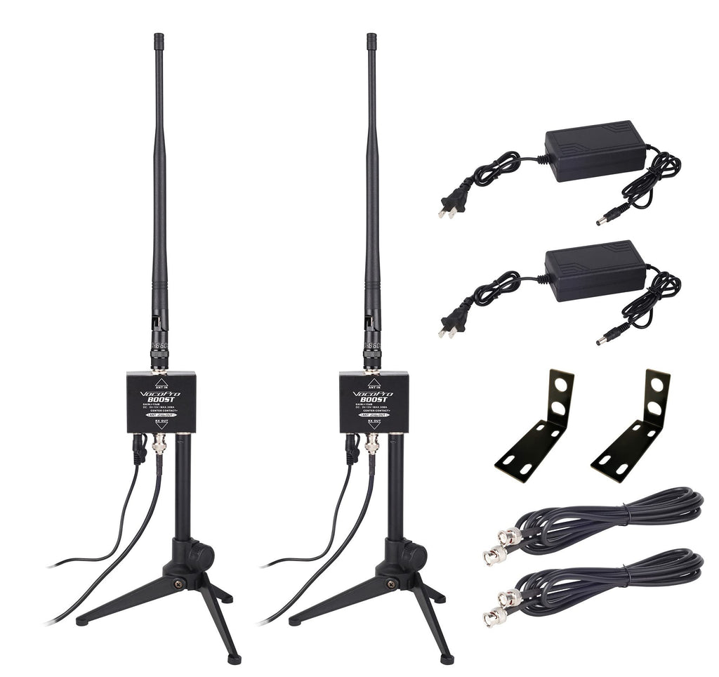 - All-inclusive package with two antenna boosters, power supplies, plug adapters, 8 foot coaxial antenna cable, wall mount bracket, and table stand