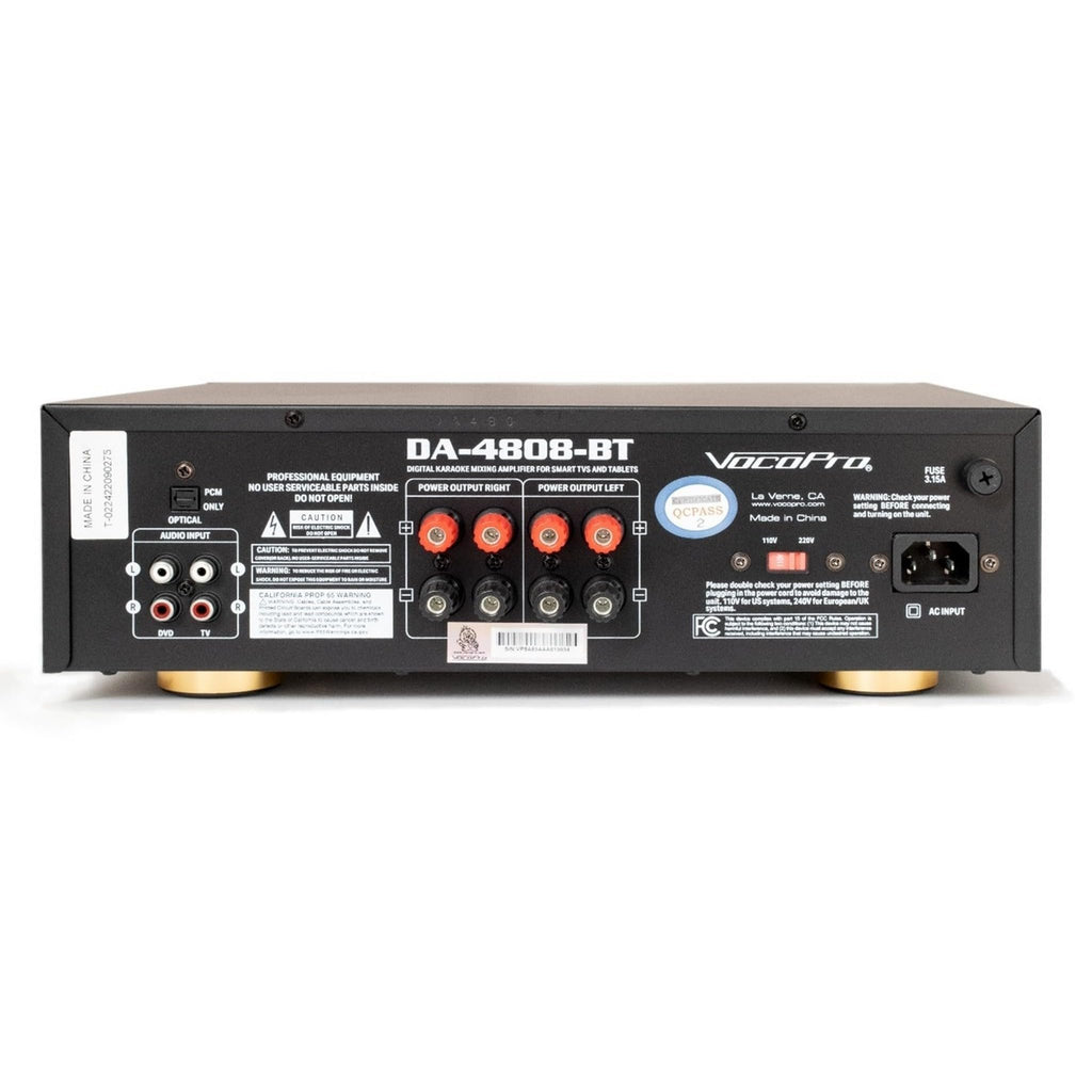VocoPro SAP-4808 250-Watt Speaker / Amplifier / Microphone PackageCompact 250W amplifier with Bluetooth, optical, RCA inputs and FM radio, with echo effects for mics and DSP effects for music. Two full-range professional vocal speakers to help your music sound great and your vocals and effects sound even better! Includes two professional wired microphones to get you singing right out of the box Item Weight: 122 pounds Vocopros new SAP-4808 is a speaker / amplifier package that will turn your smart TV into an entertainment center for karaoke, movies, and spots games. No karaoke disc or subscription required, just connect the DA-4808-BT amp to your smart TVs optical output, or use Bluetooth from your smart device or laptop.
