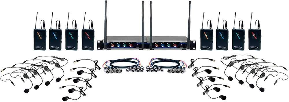 - Eight Wireless Body packs with Headsets and Lapel Mics Each Channel Has a Dedicated XLR Output and Volume Control