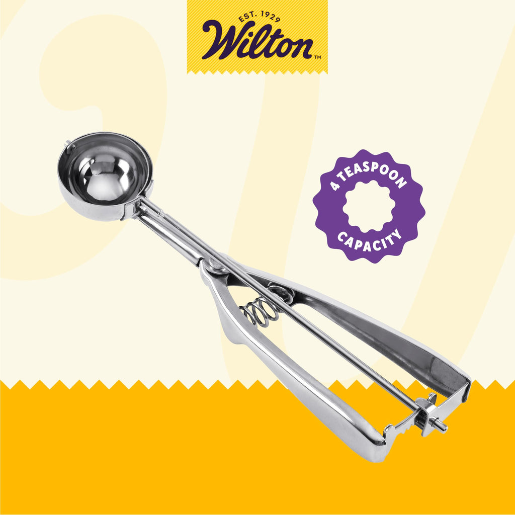 - CONVENIENT: The Wilton cookie scoop can hold up to 4 teaspoons of dough and features a squeeze spring handle for an easy release after you scoop