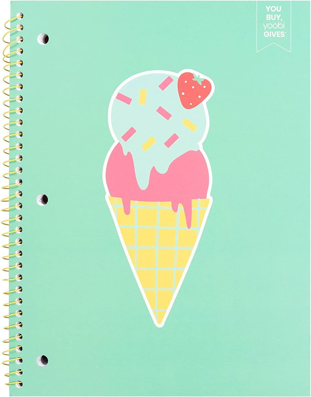 Yoobi 1 Subject Notebook Ice Cream Cone, College Ruled 100 Perforated, 3-hole Punched Sheets 2 Interior Pockets PVC Free, FSC Certified Paper 10.5 x 8.4 x 0.5
